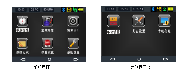 ●2.31英寸高清彩屏顯示實時濃度、報警、時間、溫度、濕度、存儲、通信、電量、 充電狀態等信息,菜單界面采用高清仿真圖標顯示各個菜單的功能名稱