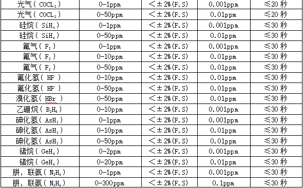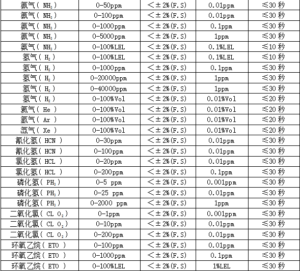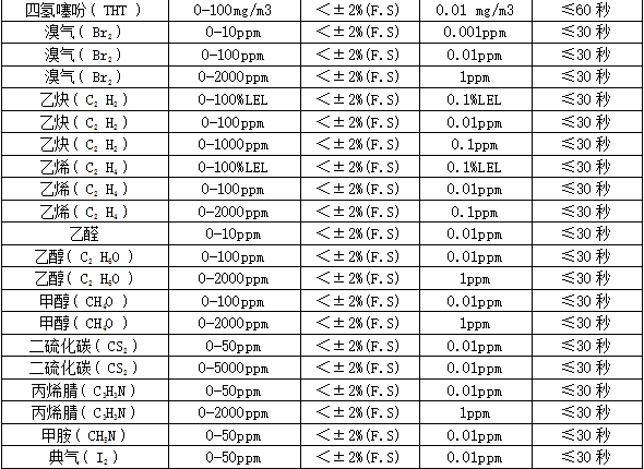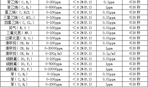 部分可檢測氣體列表: