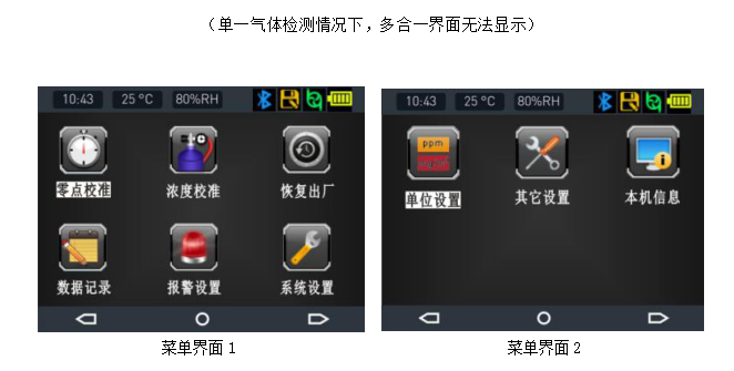 ●2.31英寸高清彩屏顯示實(shí)時(shí)濃度、報(bào)警、時(shí)間、溫度、濕度、存儲、通信、電量、充電狀態(tài)等信息,菜單界面采用高清仿真圖標(biāo)顯示各個(gè)菜單的功能名稱