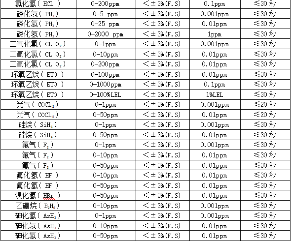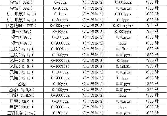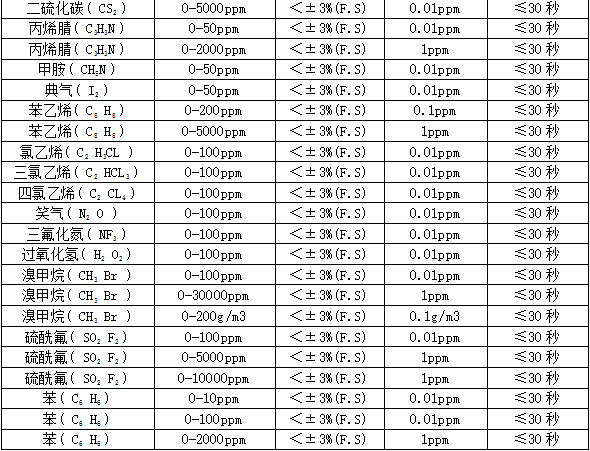 部分可檢測氣體列表: