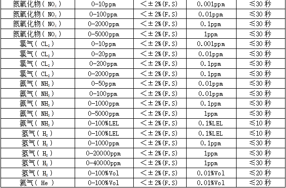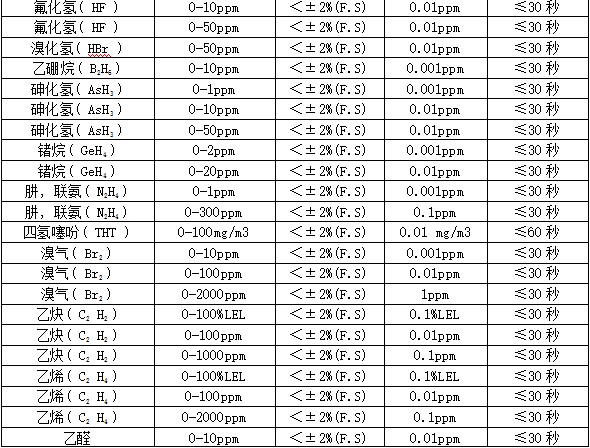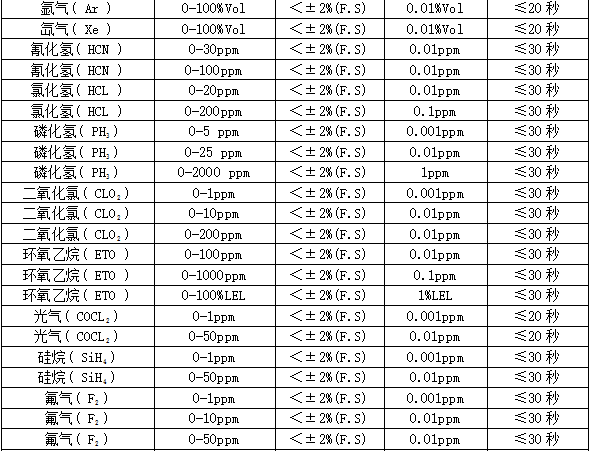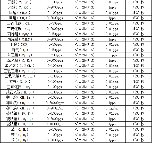 部分可檢測氣體列表: