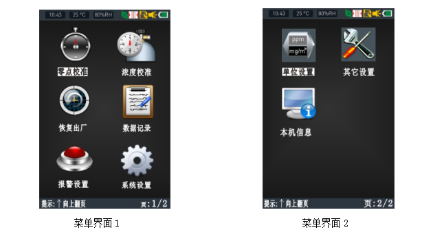 ●3.5英寸高清彩屏顯示實時濃度、報警、時間、溫度、濕度、存儲、通信、打印、電量、充電狀態(tài)等信息,菜單界面采用高清仿真圖標顯示各個菜單的功能名稱